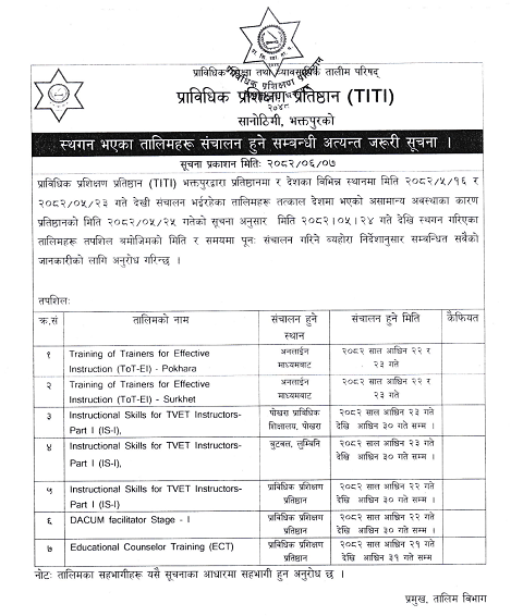 स्थगन भएका तालिमहरु संचालन हुने सम्बन्धी अत्यन्त जरुरी सूचना